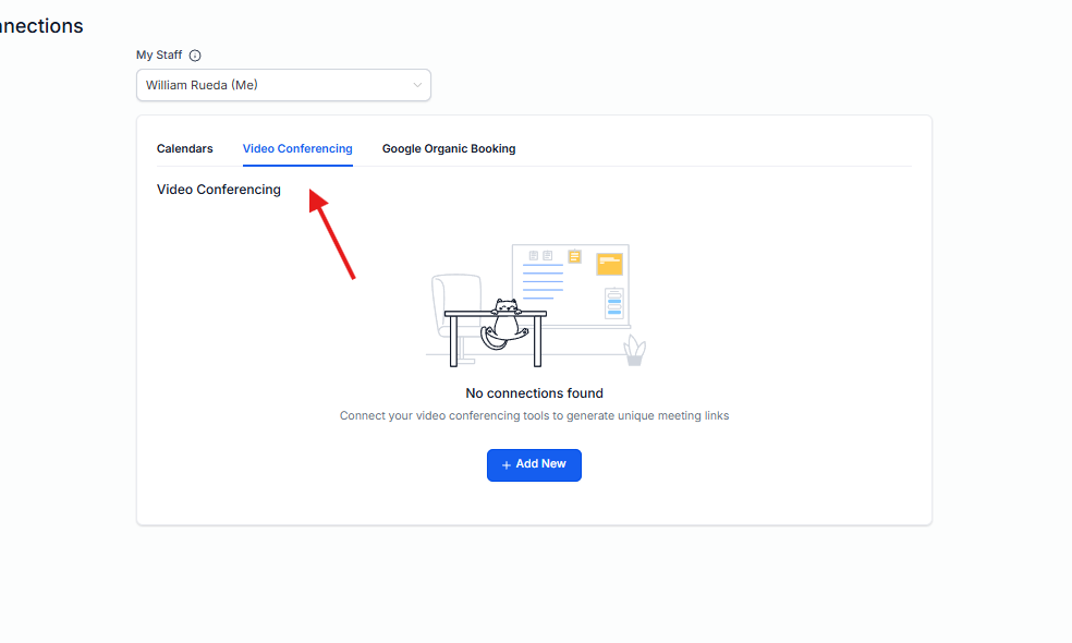Esta pestaña permite conectar herramientas de videoconferencia para que el sistema genere automáticamente enlaces de reunión al momento de agendar una cita.
