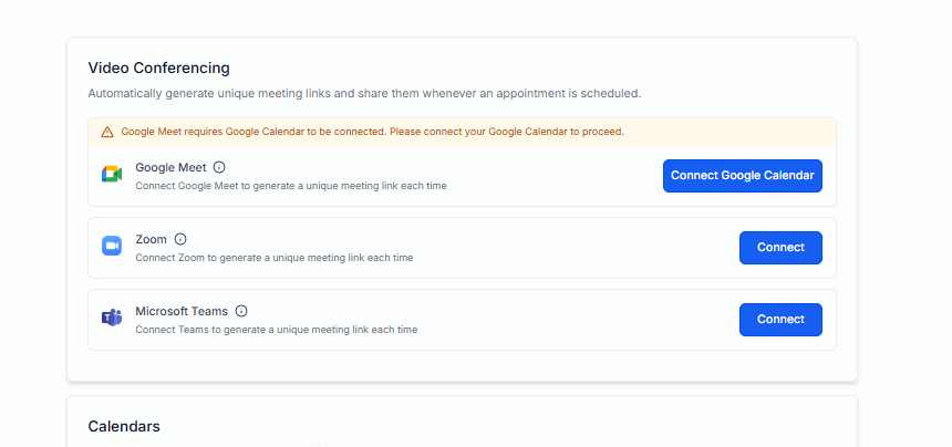 Google Meet requiere que primero esté conectado un Google Calendar.