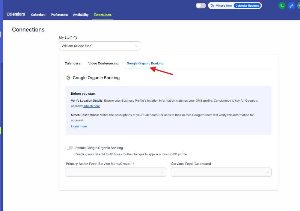 Esta sección permite habilitar las reservas orgánicas desde Google, integrando el sistema de calendarios con el perfil de Google Business Profile (GMB).