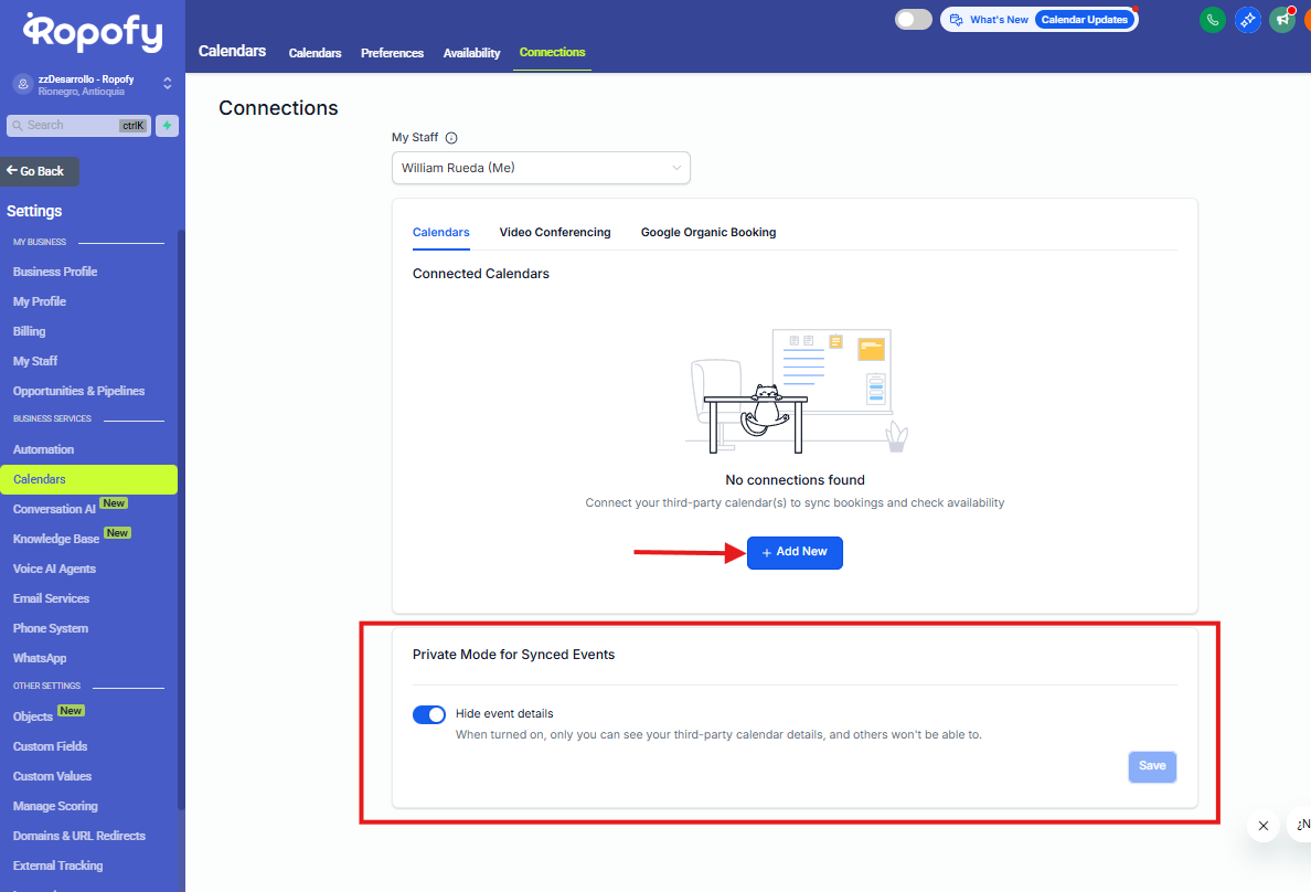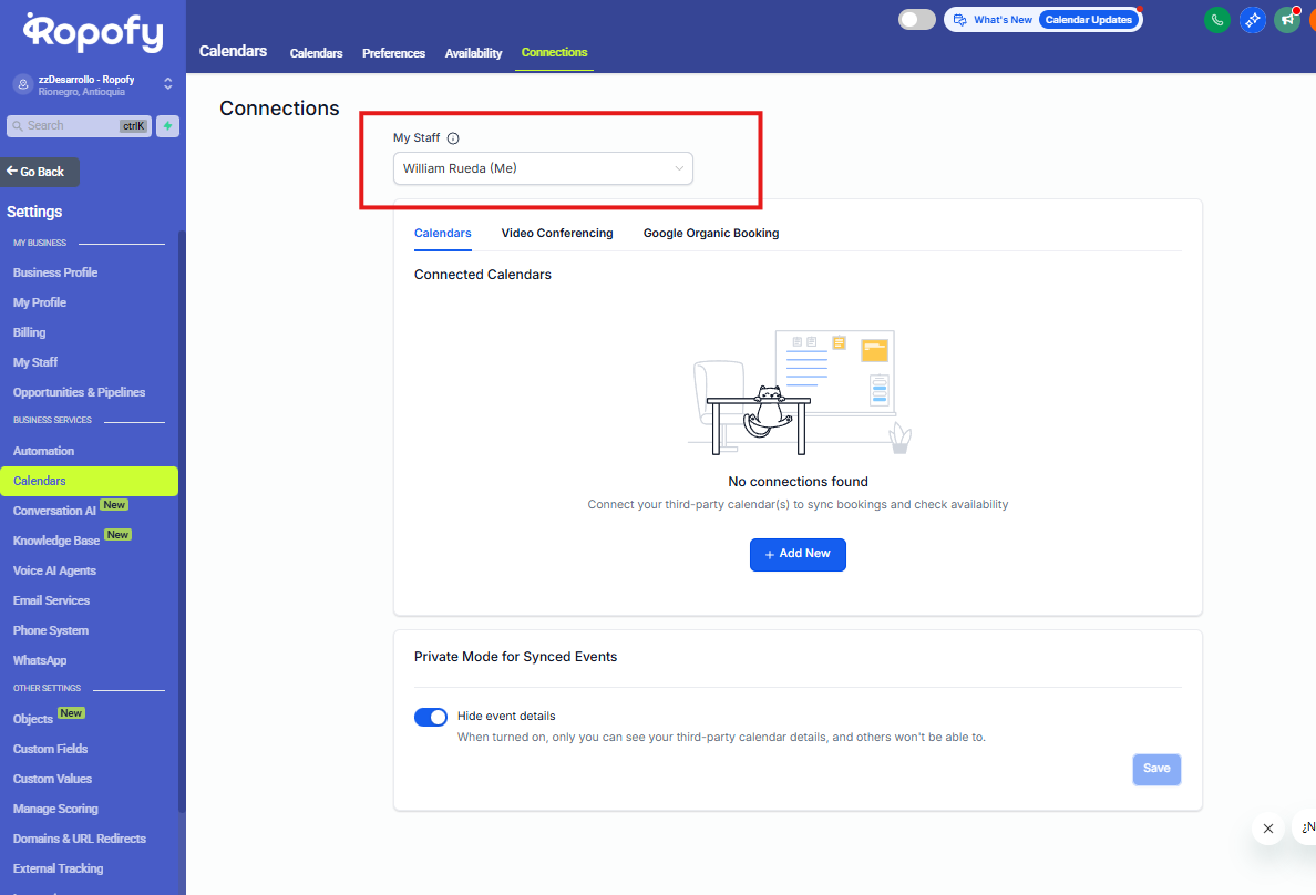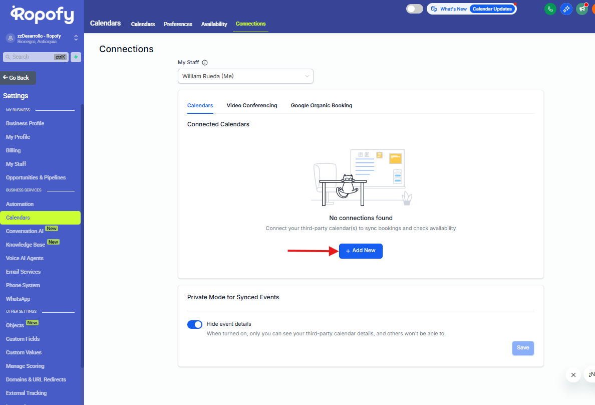 En la barra superior del módulo de Calendars, haz clic en la pestaña Connections.