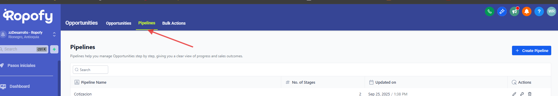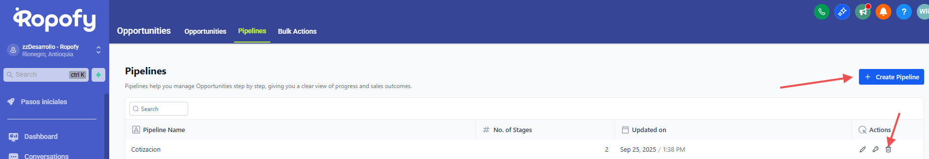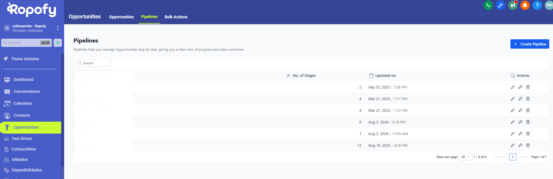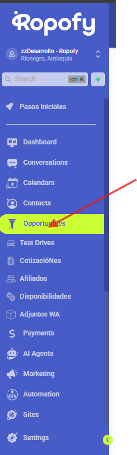 En esta área, tendrás la capacidad de construir, organizar y supervisar varios embudos que componen tu sección de oportunidades.