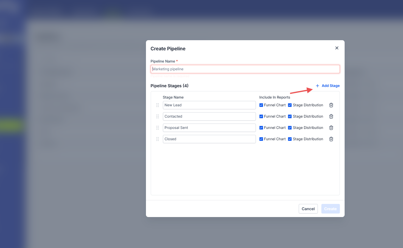 Cuando estés listo para agregar una nueva etapa, harás clic en este botón y nombrarás la etapa en consecuencia.