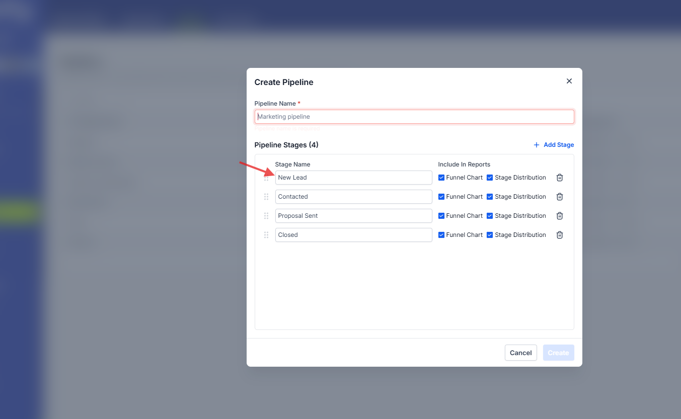 Cuando estás creando un nuevo embudo, es recomendable darles nombres según su propósito o la fuente de los clientes potenciales. Podemos tener embudos nombrados como "Google Ads, Facebook Ads, Website Leads", etc.