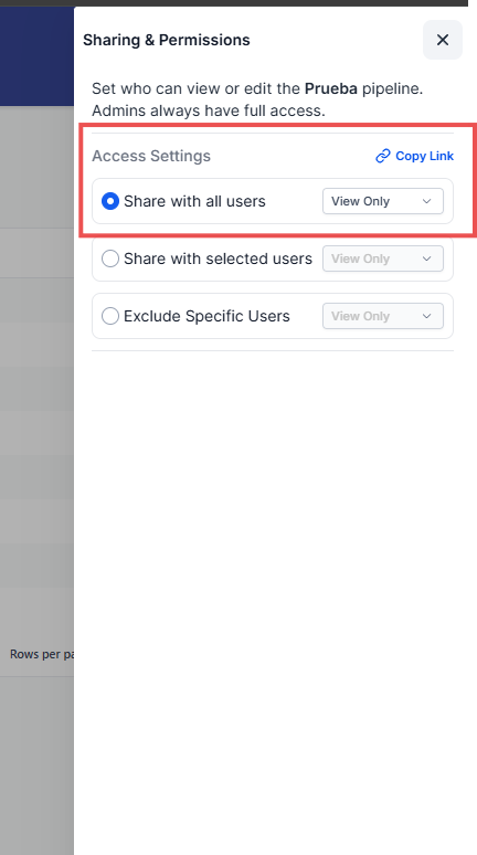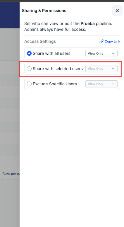Permite que todos los usuarios del CRM tengan acceso al embudo, según el nivel de permiso asignado.Compartir con usuarios seleccionados: