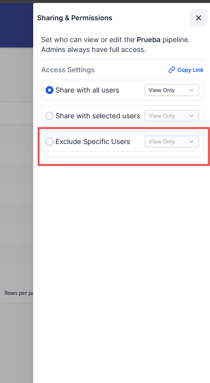 Habilita el acceso únicamente a los usuarios que elijas manualmente, ideal para embudos gestionados por equipos específicos.Excluir usuarios específicos: