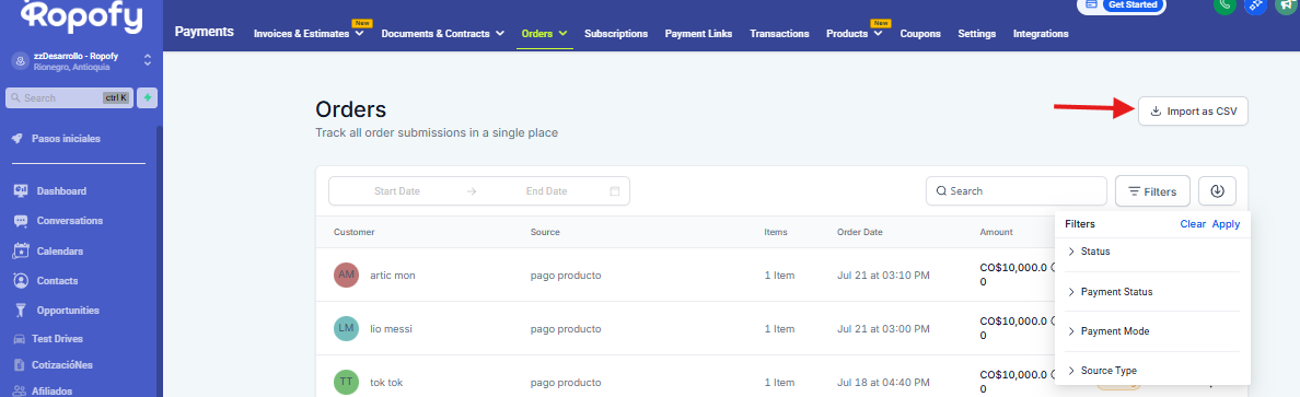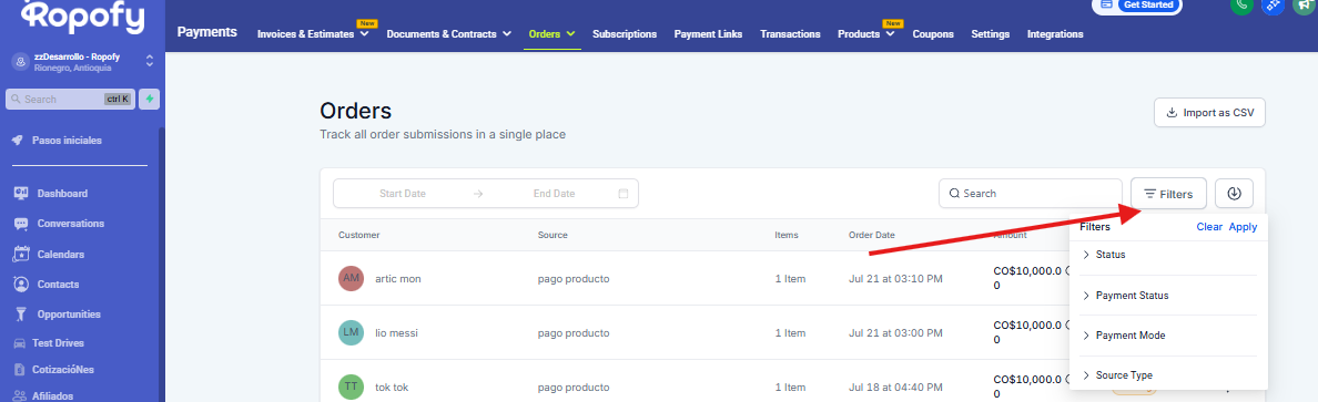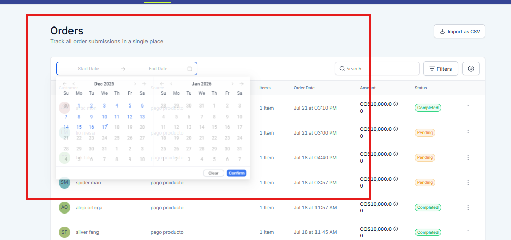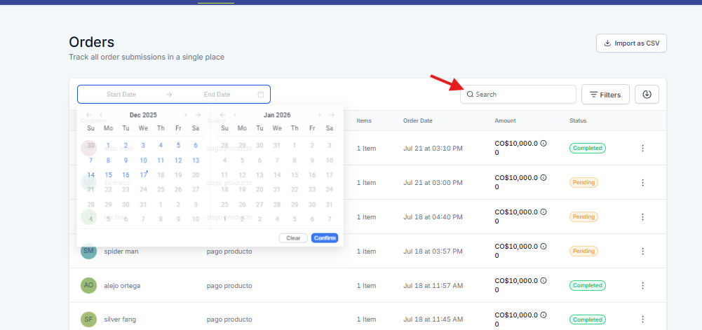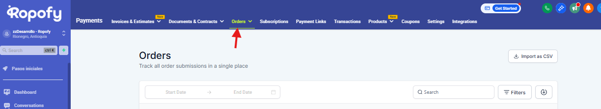 La sección Orders permite visualizar y gestionar todas las órdenes generadas en la plataforma. En la parte superior se muestra el título: