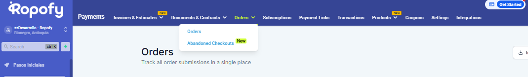 Esta opción aparece como un submenú de Orders y cuenta con una etiqueta "New".