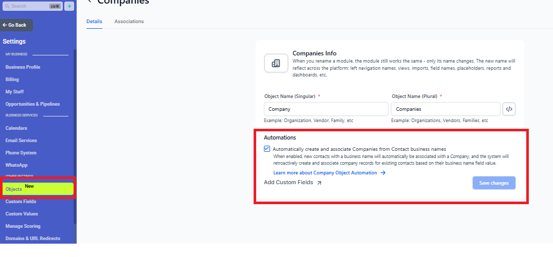 Si deseas que al momento de mapear el "Business Name" se asocie con el Company debemos activar la función Automations en el Modulo de Objetcs -> Companies