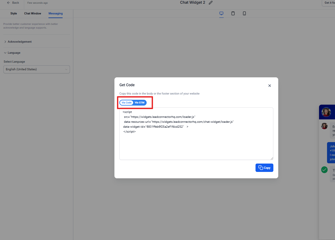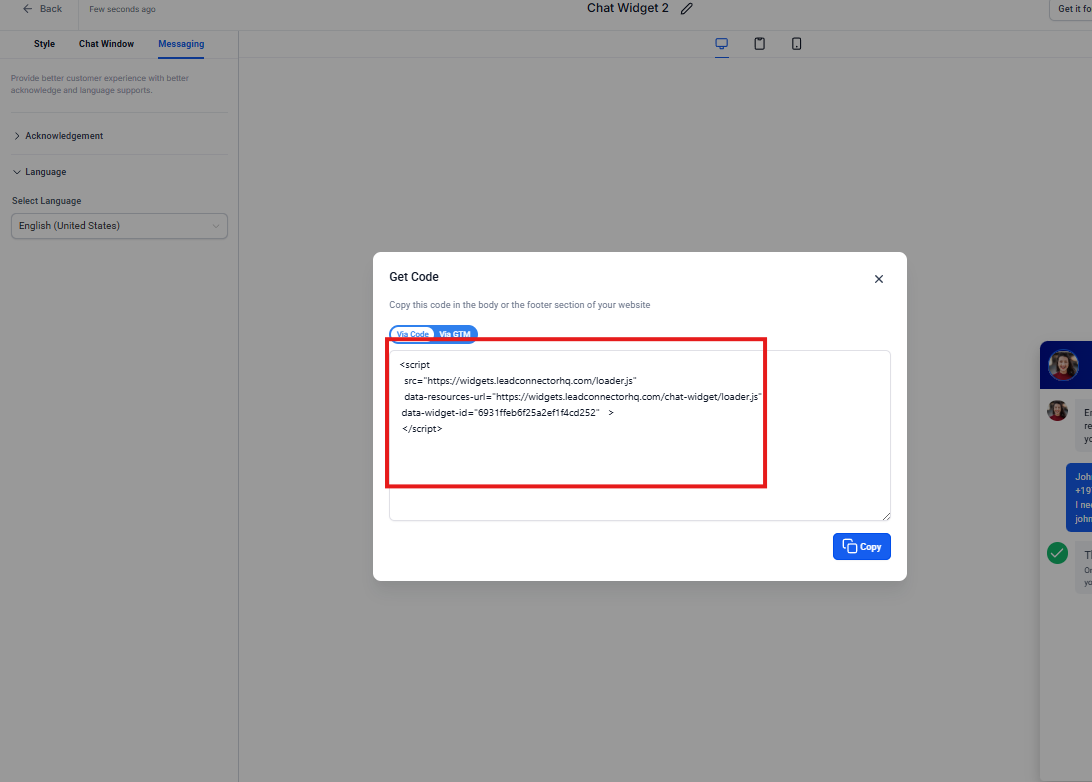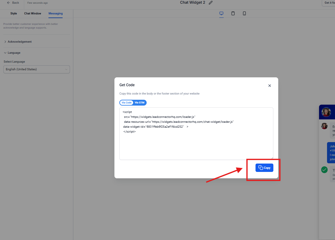 Aquí encontrarás el código que necesitarás instalar en tu sitio web o aplicación para que este widget de chat se muestre a los visitantes.