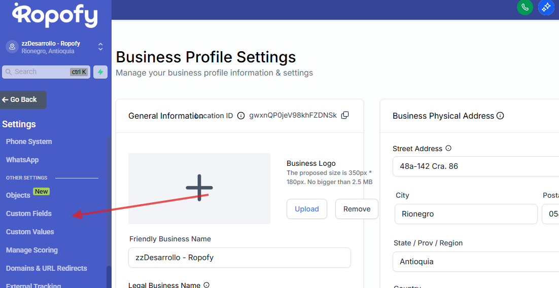 Luego vamos a "Campos personalizados" o "Custom Fields"