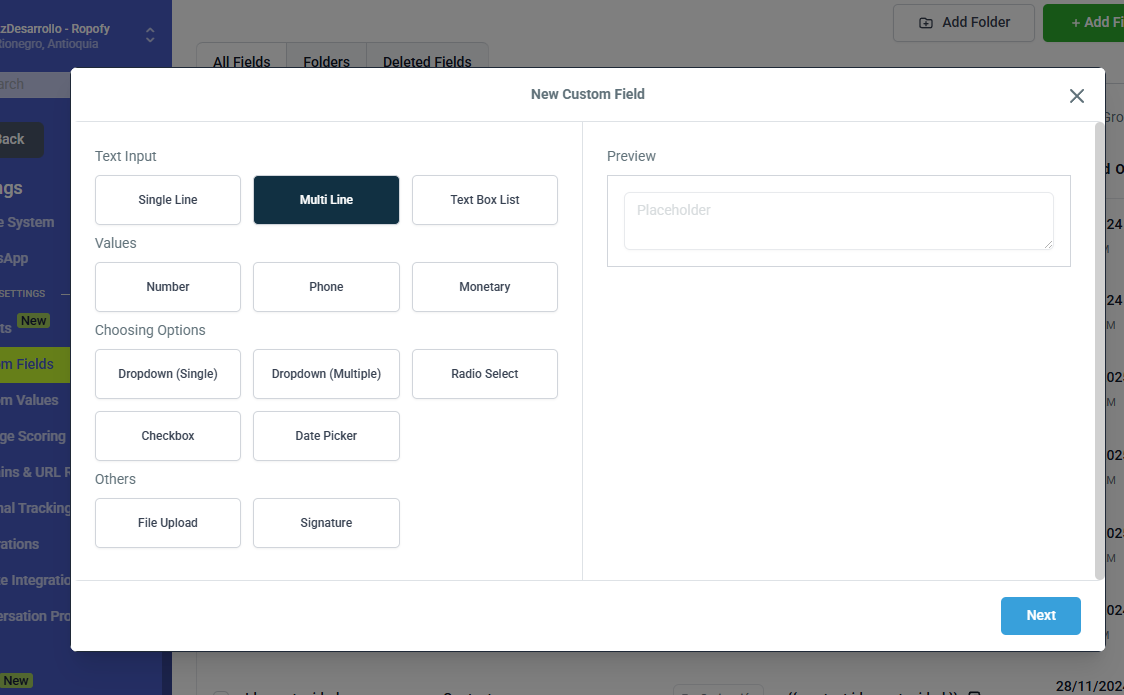 Una vez seleccionado el tipo de campo, se continúa con la opción Next.