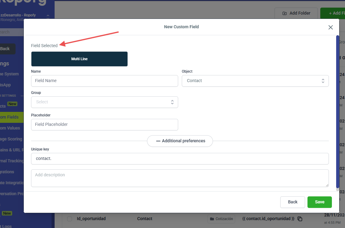 Para crear un campo personalizado, localiza el botón verde "Agregar Campo" en la parte superior derecha de la pantalla, haz clic en él y observa cómo aparece una ventana emergente. En ella, puedes completar todos los detalles necesarios para agregar tu campo personalizado.