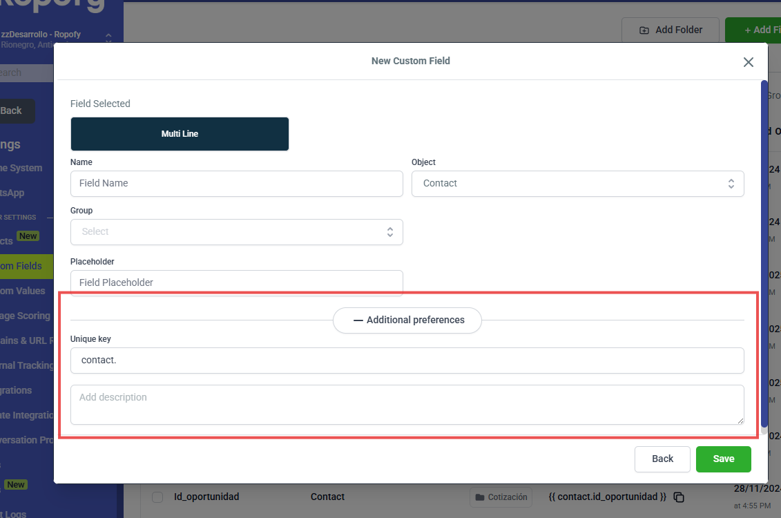 En la sección de preferencias adicionales se muestra la clave única del campo. Esta clave se genera automáticamente a partir del objeto y el nombre del campo, por ejemplo contact.prueba, y es utilizada a nivel técnico para referenciar el campo en formularios, workflows, automatizaciones, mensajes y correos electrónicos.