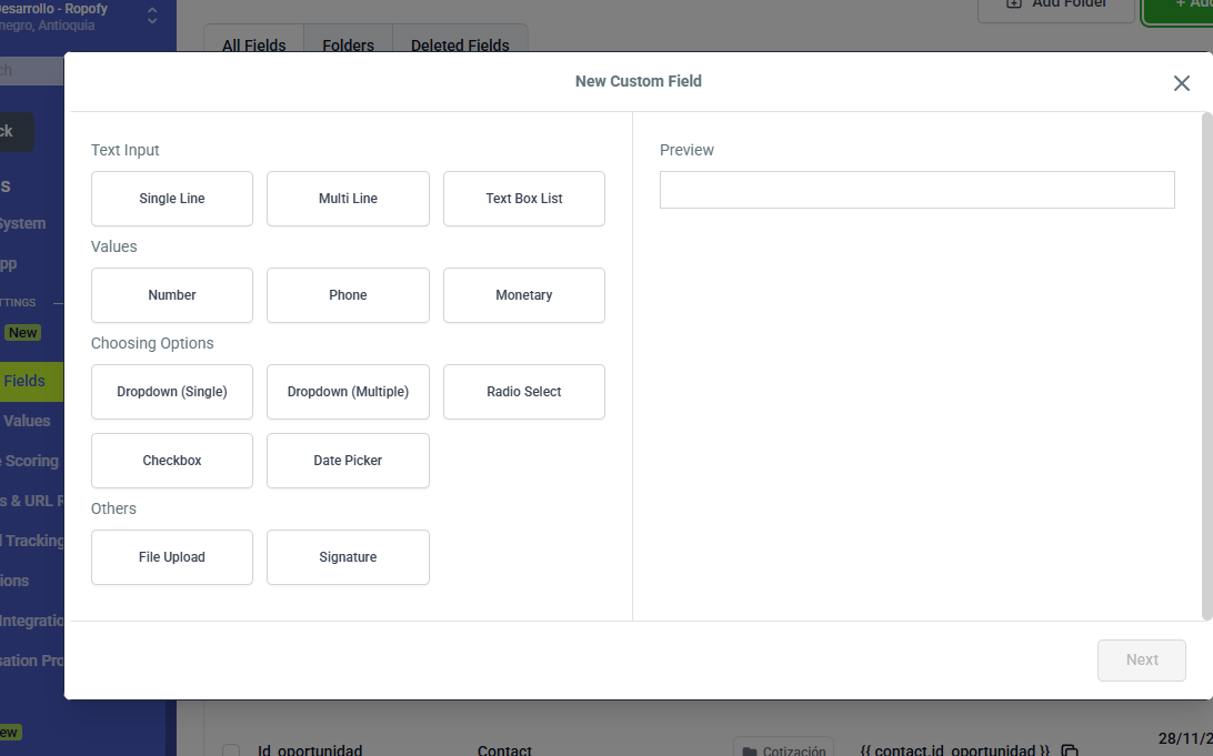 La pantalla se divide en dos secciones. En el panel izquierdo se presentan las categorías de Custom Fields disponibles y, dentro de cada categoría, los tipos de campo específicos. En el panel derecho se muestra una vista previa del campo seleccionado, permitiendo validar su apariencia y comportamiento antes de continuar.