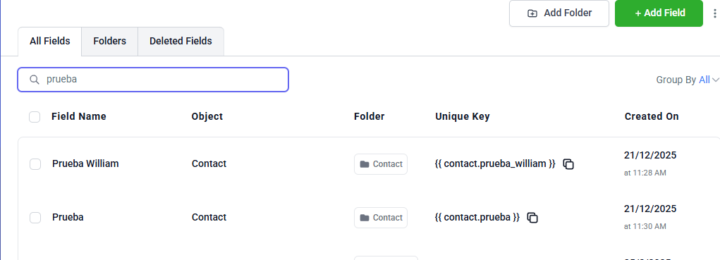En este listado se muestra el nuevo campo creado, indicando el nombre del campo, el objeto asociado, la carpeta en la que fue organizado y su clave única en formato dinámico, la cual puede copiarse directamente para su uso en automatizaciones o plantillas.