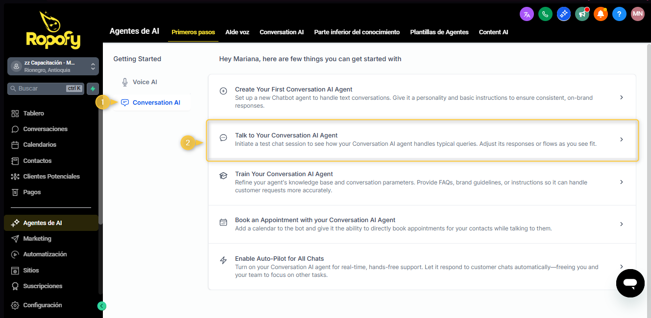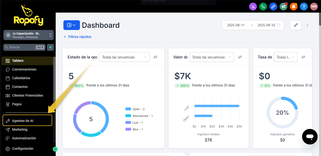 Inicia sesión en Ropofy y ve al menú principal. Dentro del panel lateral izquierdo, busca y haz clic en “Agentes de Inteligencia Artificial”.