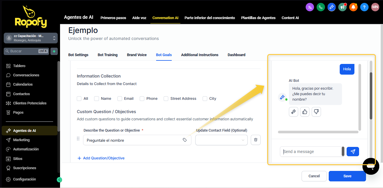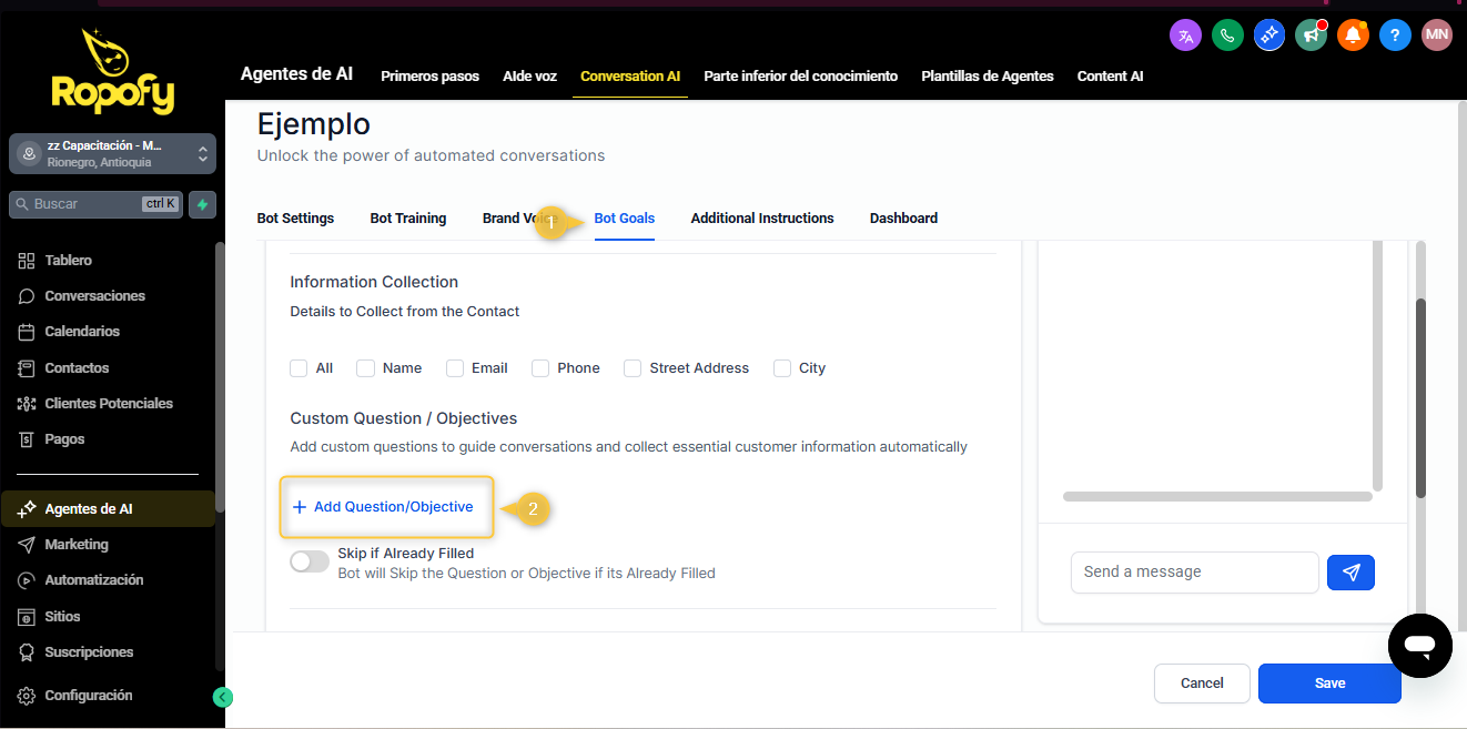 Pasos a paso para configuración avanzada de campos de contacto por agentes IA en Ropofy