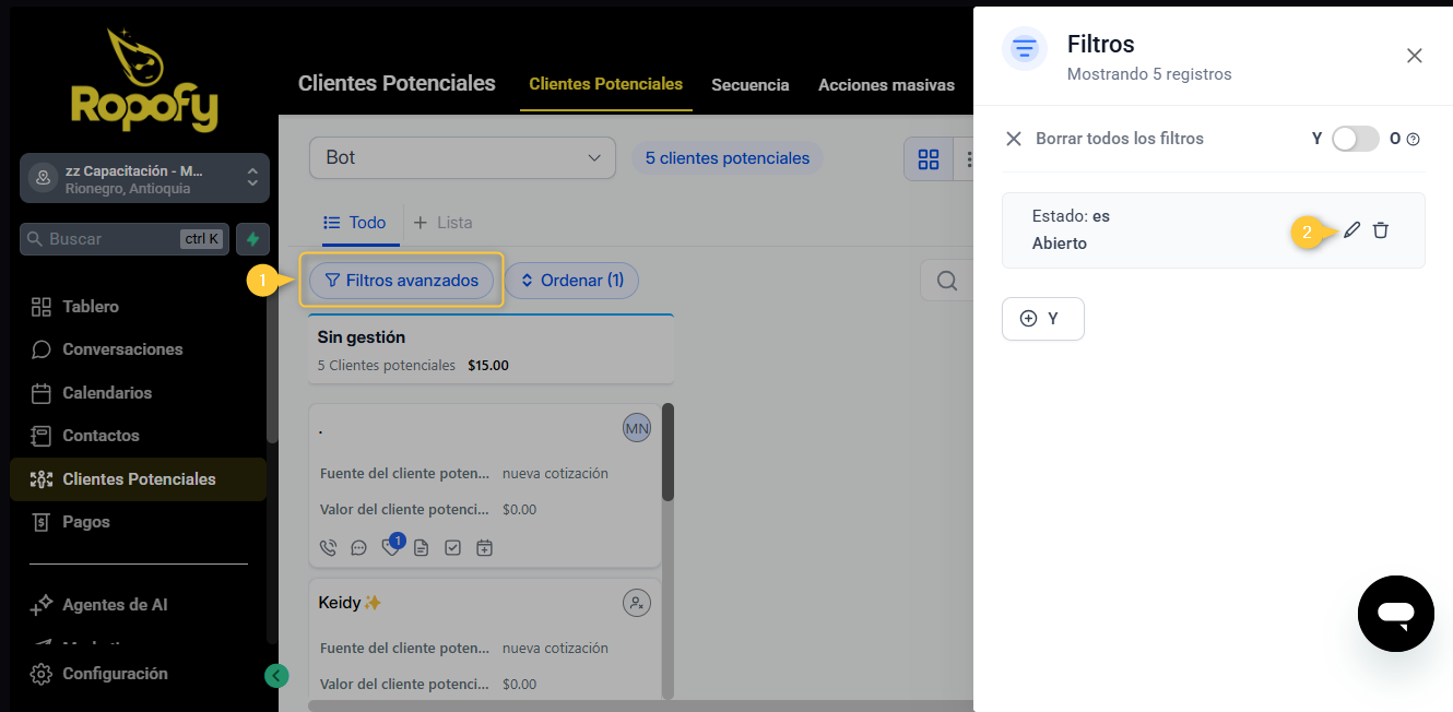 - Localiza el botón de filtro avanzado. Esto abrirá un menú lateral derecho, a primera vista se vera el filtro de las oportunidades visibles, para editarlas presiona el lápiz.