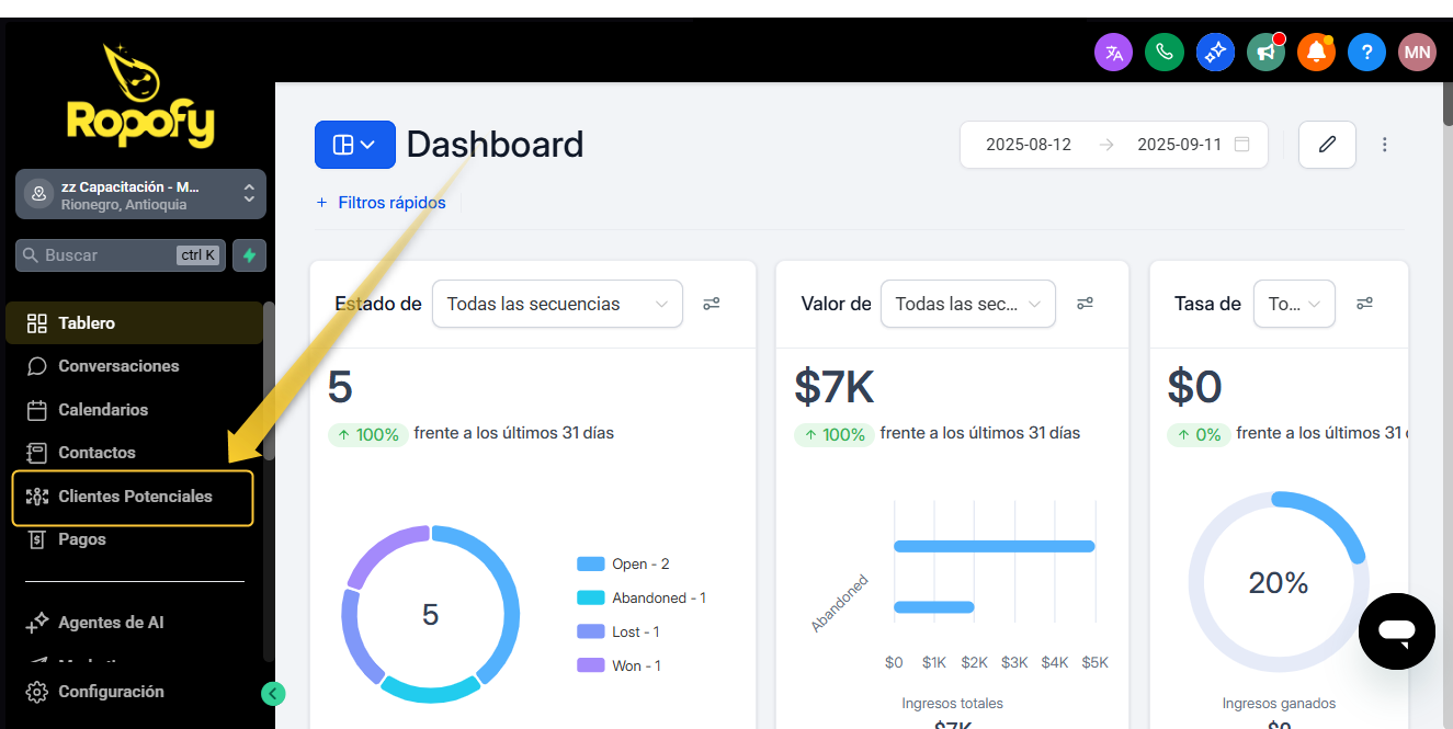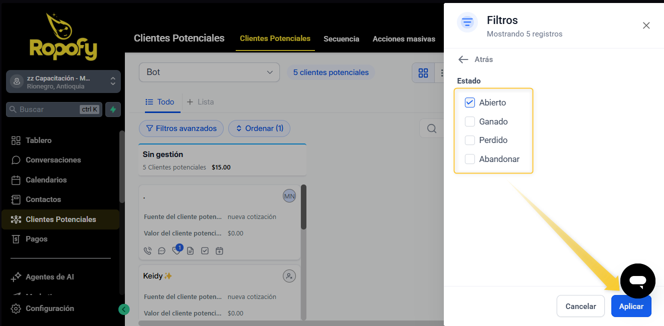 Esta guía tiene como propósito explicar detalladamente cómo visualizar todas las oportunidades registradas en el módulo de Oportunidades de Ropofy. Muchas veces los usuarios creen que ciertas oportunidades han desaparecido o no fueron cargadas, cuando en realidad no están visibles por los filtros de estado predeterminados del sistema.