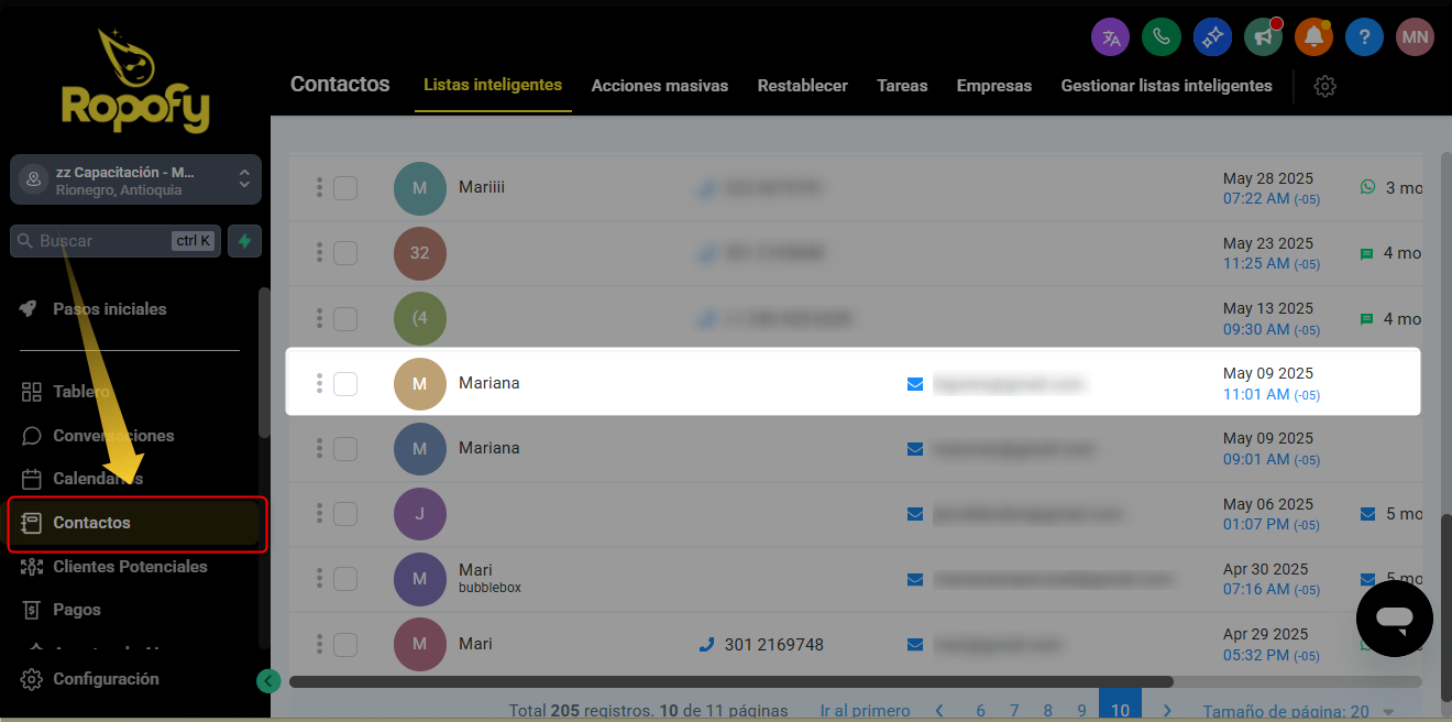 1. Ingresa a Ropofy y abre la ficha del contacto que deseas retirar del flujo.