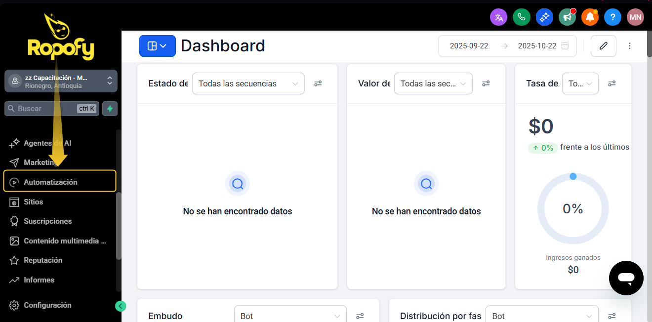 1. Ingresa a Ropofy y dirígete a la sección Automatizaciones en el menú lateral.