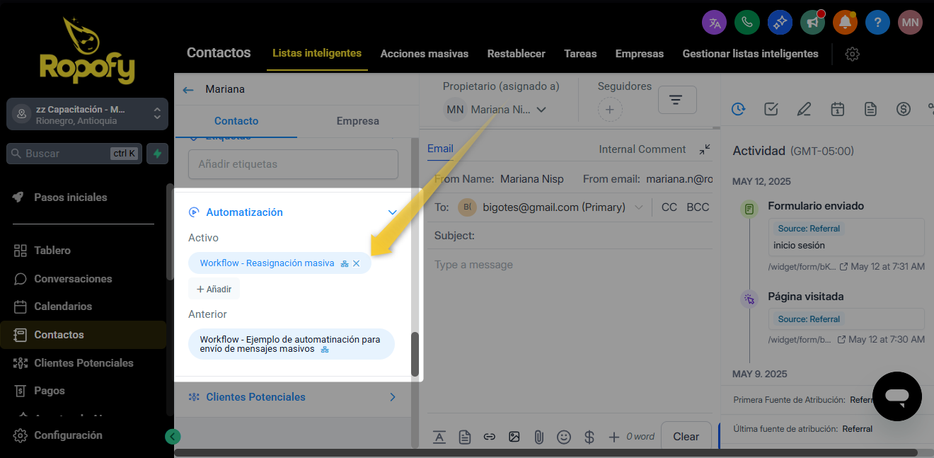- En la ficha del contacto, verifica que el flujo del que fue removido ya no esté listado en la sección de automatización.