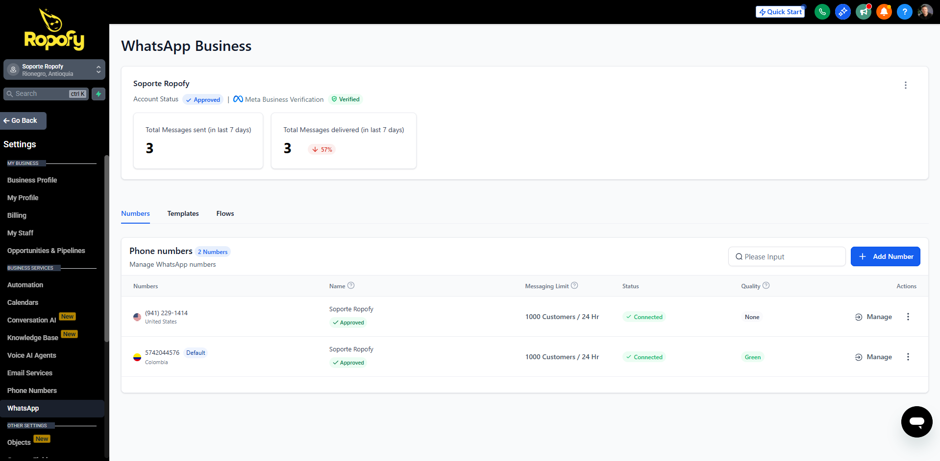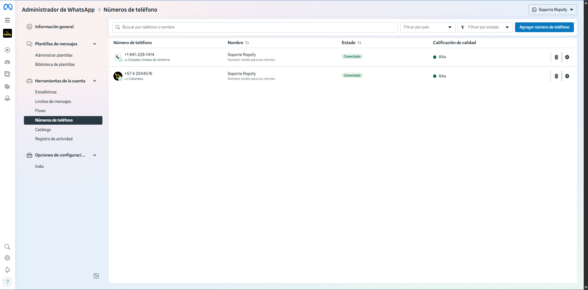 ⚠️ Importante: Un mismo número no puede estar activo a la vez en API y en la App. Para usarlo en la App primero hay que liberarlo del API en Facebook/Meta Business Manager, y desconectarlo de Ropofy.