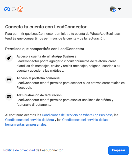 Te llevará al administrador de cuenta de Whatsappa de tu portafolio comercial de Meta.