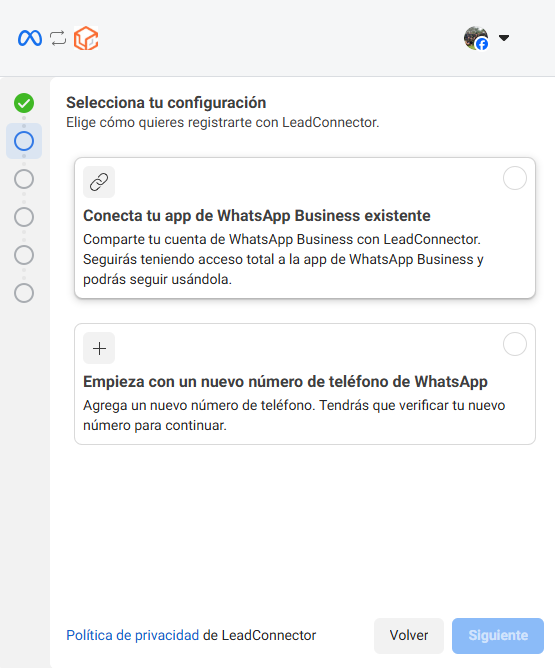 5. Selecciona la opción Conecta tu app de Whatsapp Business existente