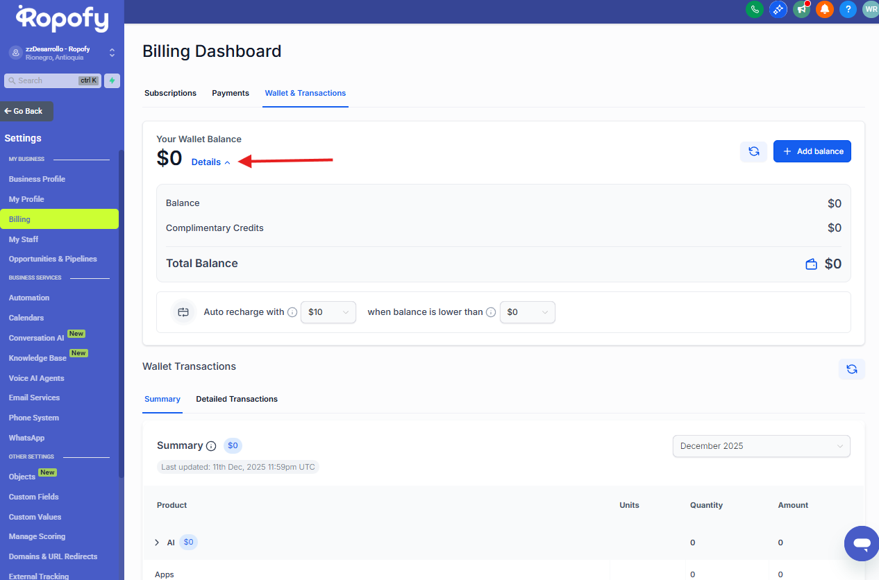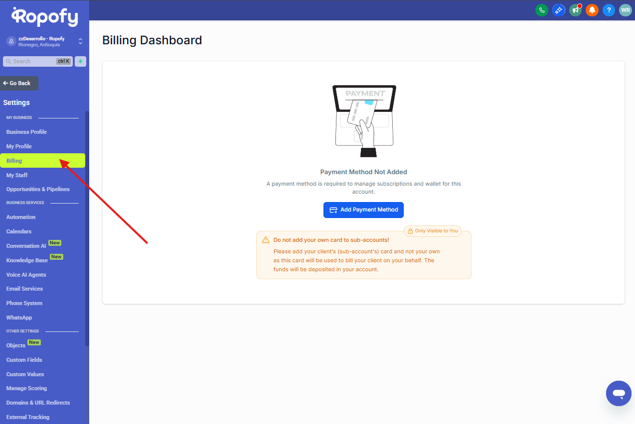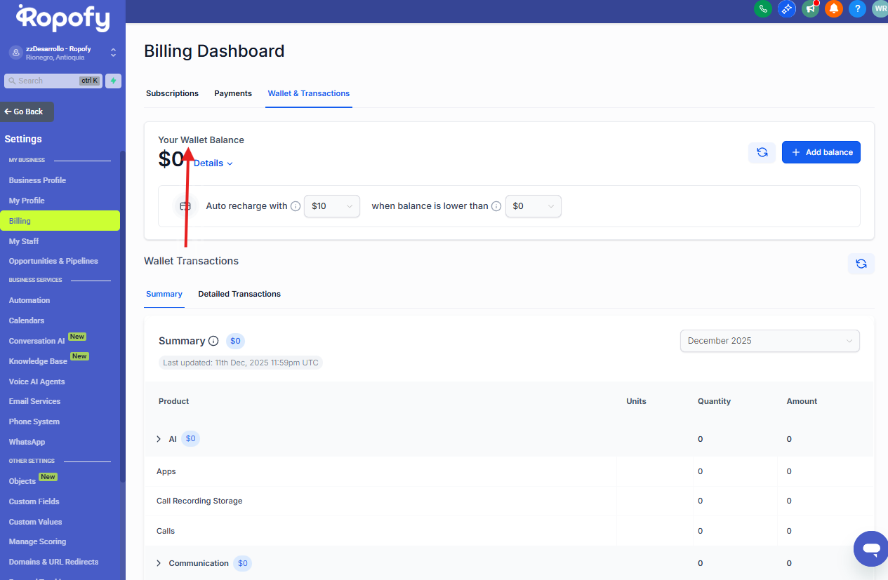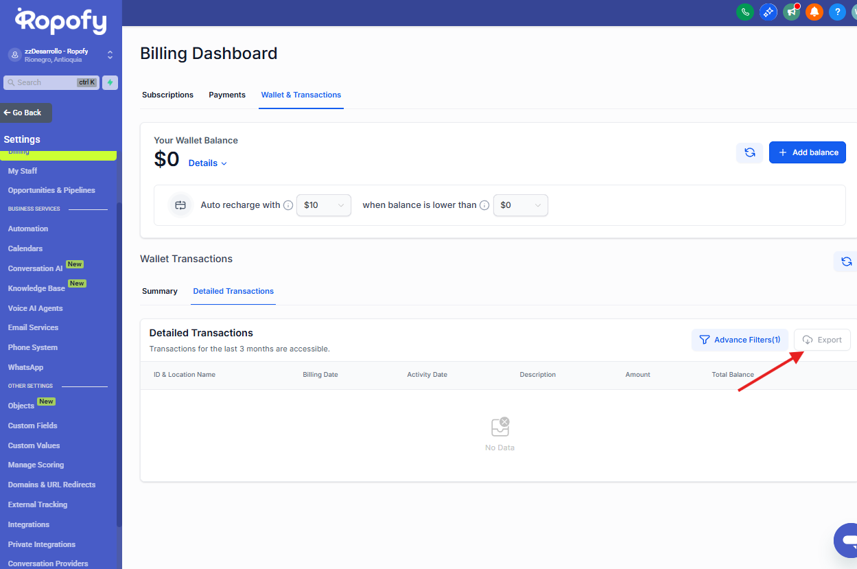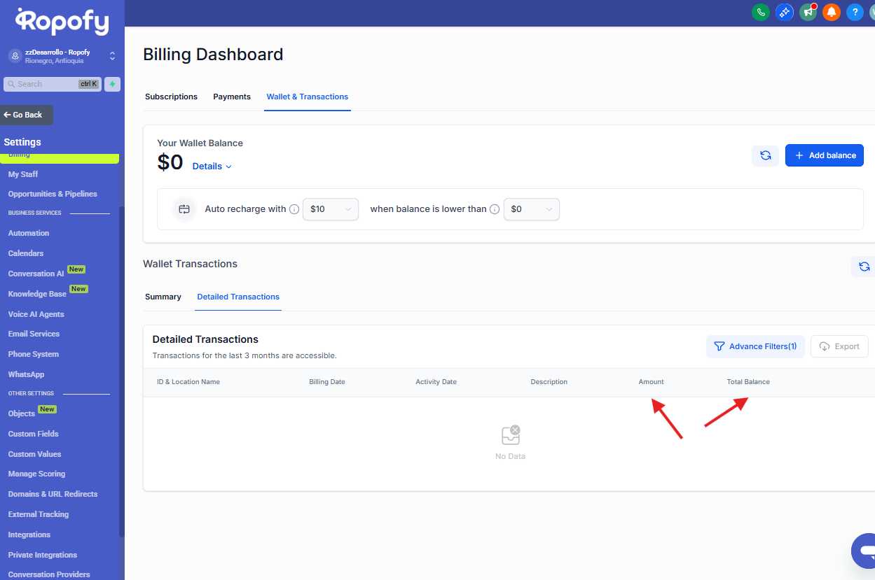 Desde este menú podrás encontrar la sección Billing o Facturación, donde se encuentra disponible el módulo de Wallet & Transactions.