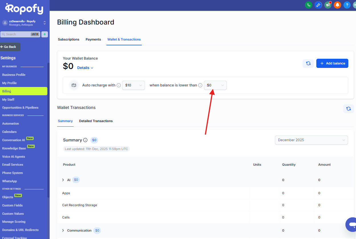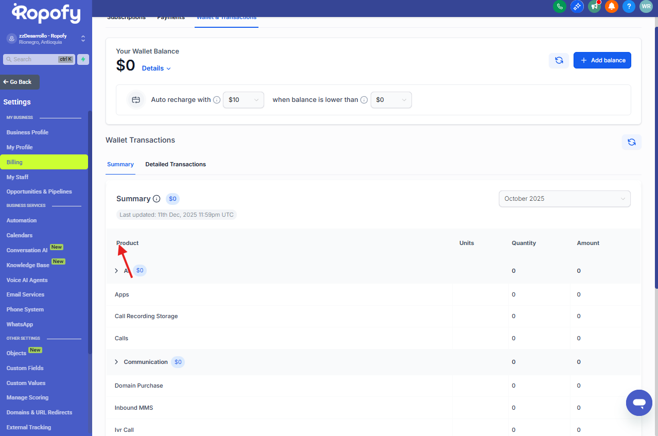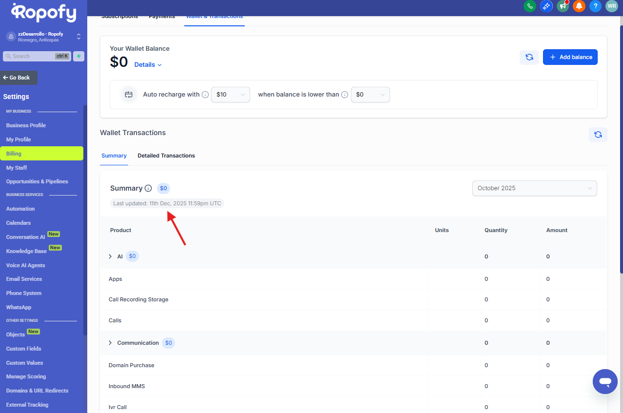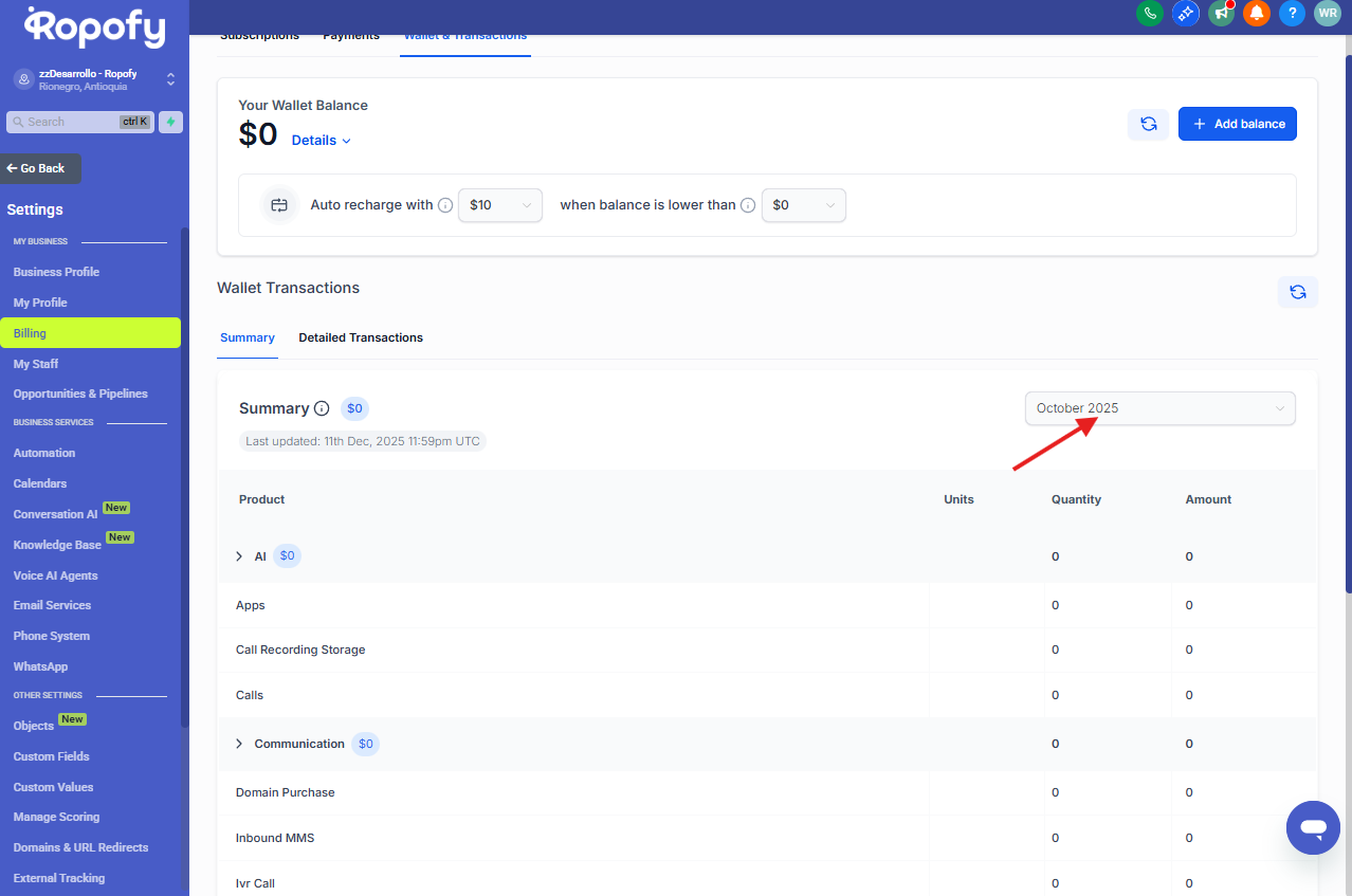 Desde este menú podrás encontrar la sección Billing o Facturación, donde se encuentra disponible el módulo de Wallet & Transactions.