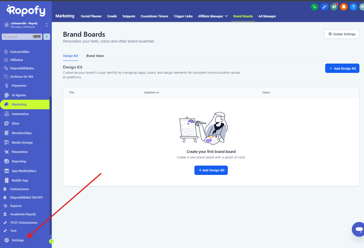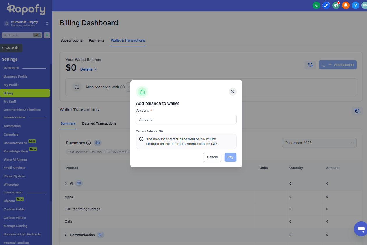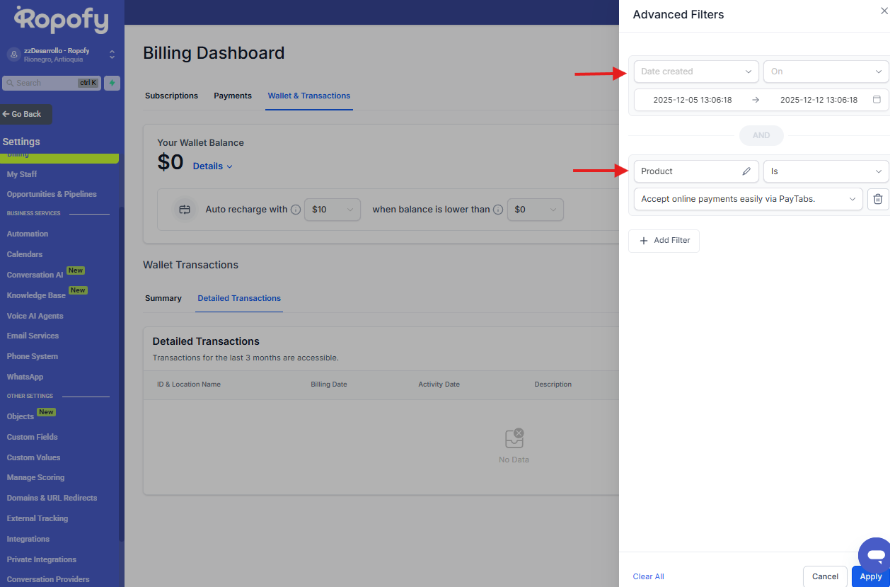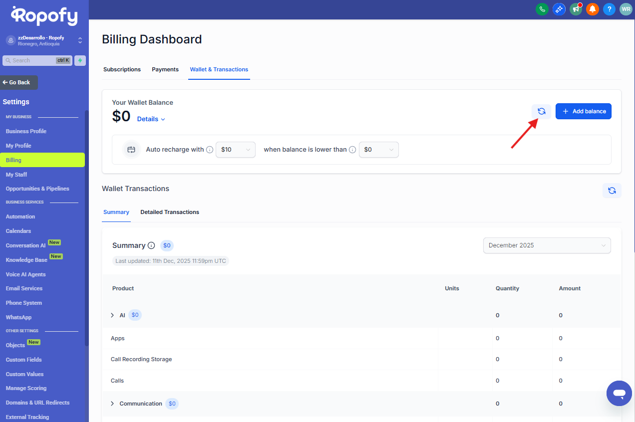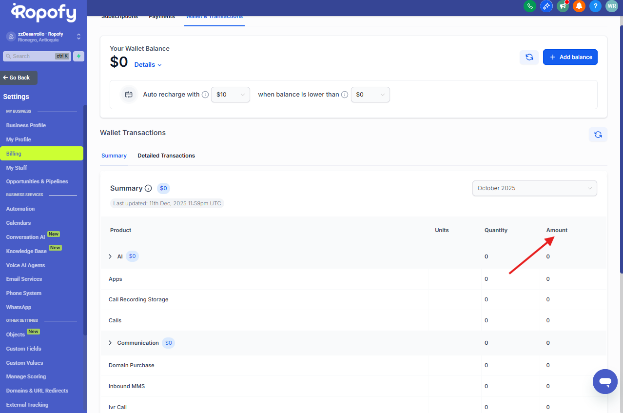 Desde este menú podrás encontrar la sección Billing o Facturación, donde se encuentra disponible el módulo de Wallet & Transactions.
