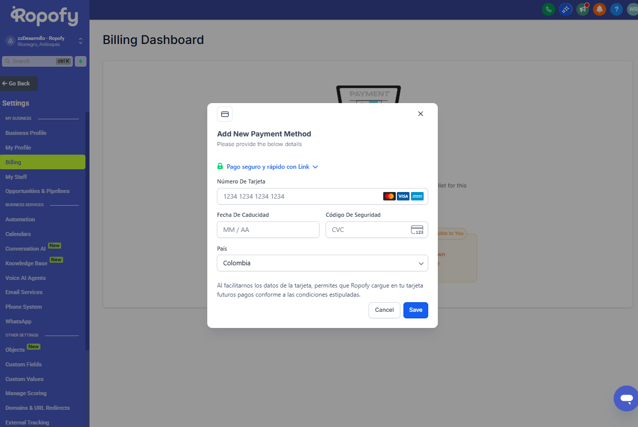 En este punto debemos añadir un método de pago, el cual será utilizado para realizar las recargas automáticas o manuales a nuestra Wallet configurada en Ropofy.