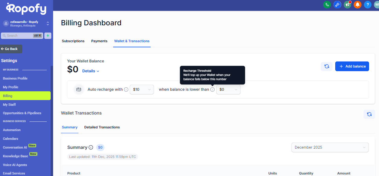 Botón “Add balance”: Permite agregar crédito manualmente a la billetera mediante un método de pago asociado.
