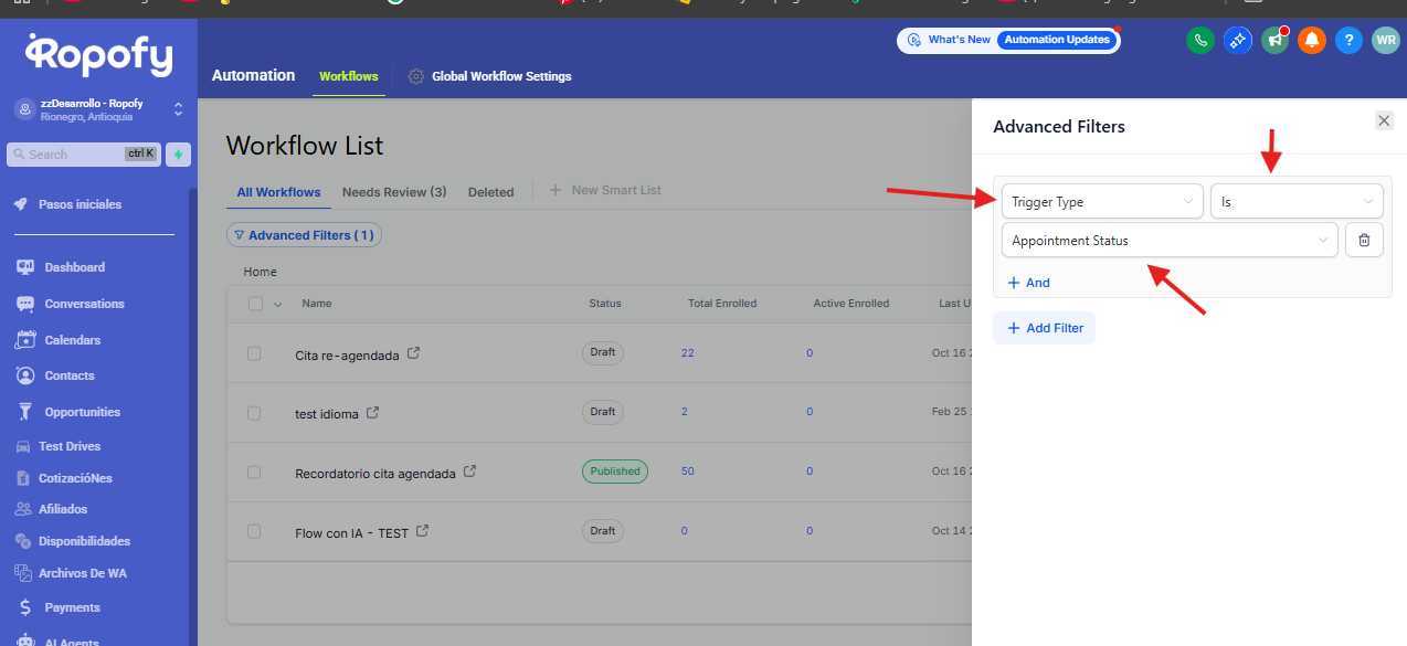 En estos casos, se recomienda realizar la búsqueda por “Trigger Type” o “Tipo de Disparador”. Luego, seleccionamos la opción “Is” o “Es” dentro del desplegable de condiciones y, finalmente, buscamos aquellos flujos que tengan configurado como disparador un “Appointment Status” o “Estado de Cita”.