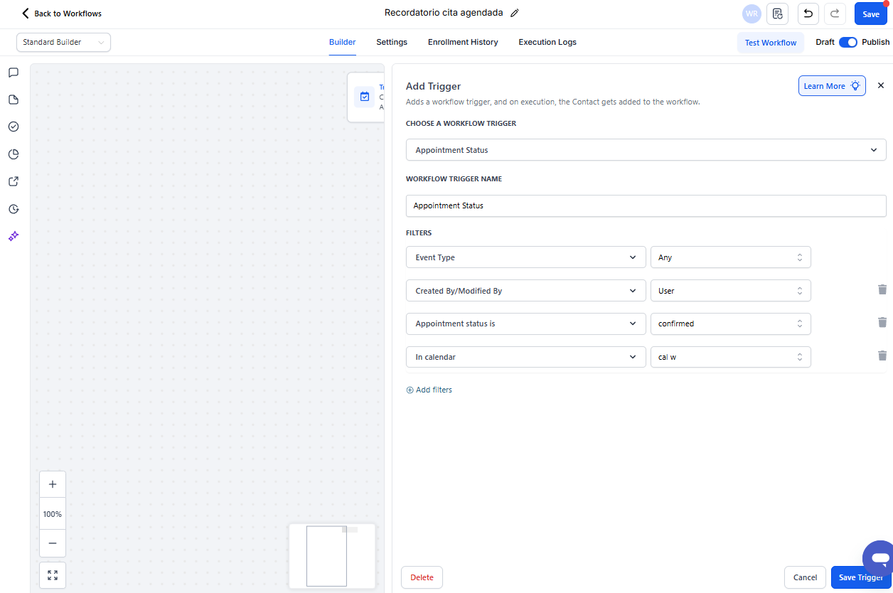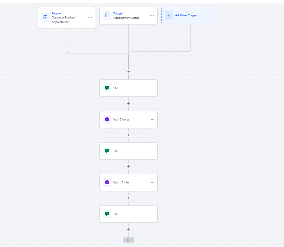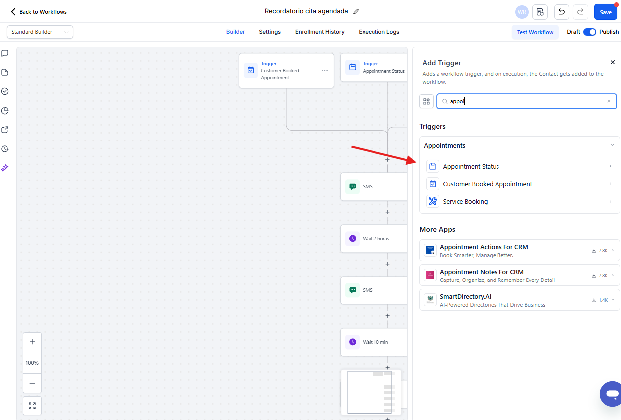 Normalmente, se utiliza como disparador el “Appointment Status” o “Estado de la cita”, ya que permite identificar el estado actual de una cita y, a partir de este, ejecutar recordatorios iniciales de manera automática.