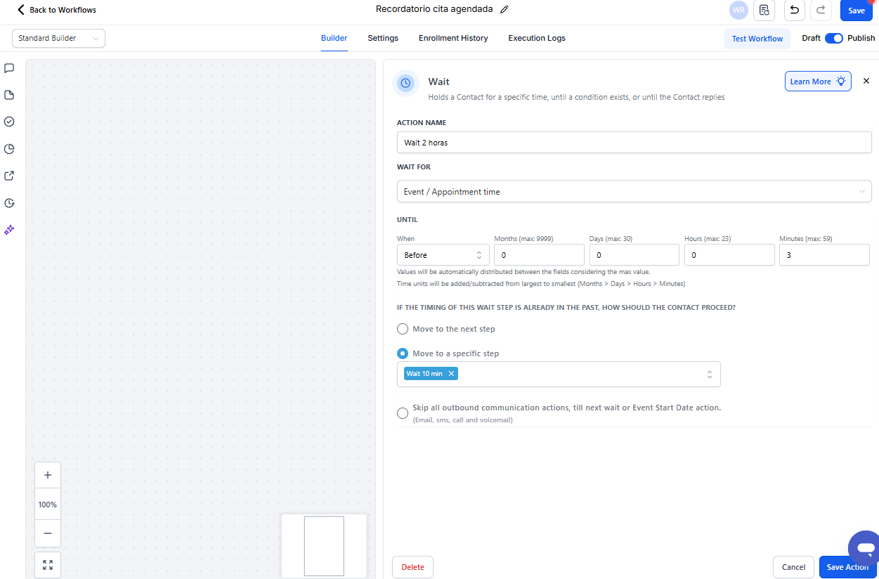 - El Wait calcula cuándo ejecutar la siguiente acción (ej: 2 horas antes de la cita).