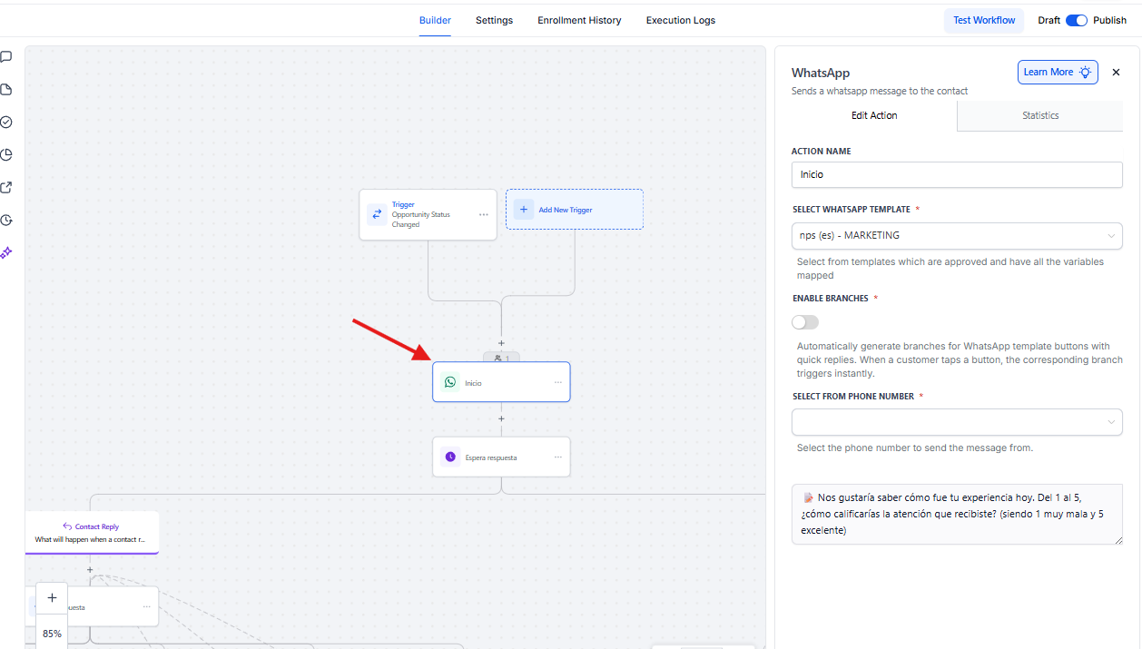 nps (es) – MARKETINGLa acción utiliza una plantilla de WhatsApp previamente aprobada, lo cual garantiza el cumplimiento de las políticas de WhatsApp para mensajes automatizados.