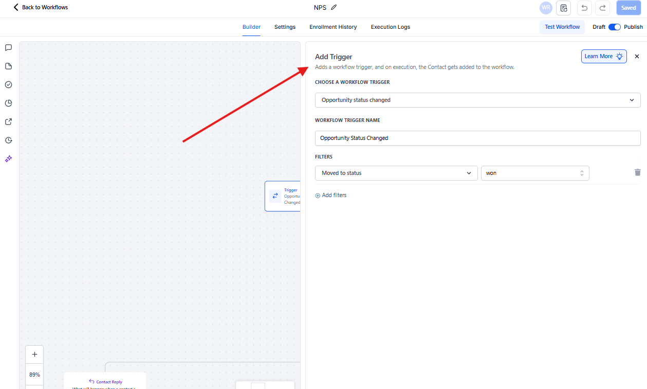 En este caso, el workflow se activa cuando una oportunidad cambia su estado a “Won” (Ganada) dentro del pipeline. Al detectarse este cambio de etapa, el sistema inscribe automáticamente al contacto en el flujo de trabajo y comienza la ejecución de las acciones configuradas.
