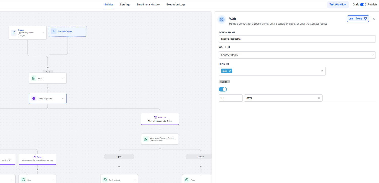 1 díaSi el contacto no responde dentro del tiempo definido, el flujo continúa automáticamente por la ruta de timeout, permitiendo manejar escenarios donde no se recibe respuesta.