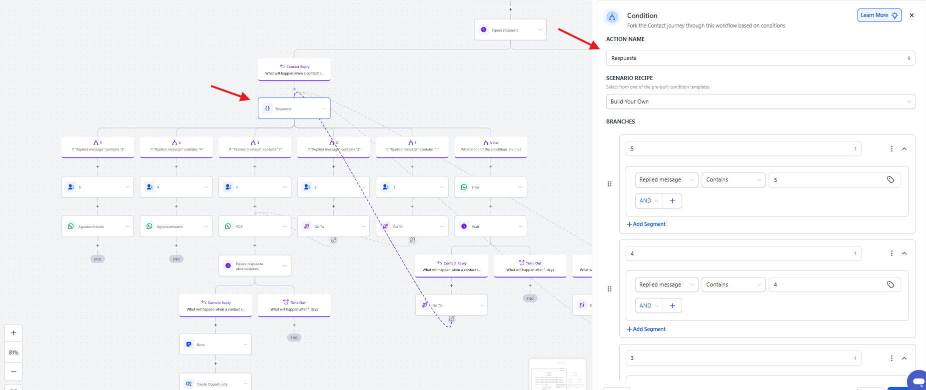 En esta sección se construyen las reglas para evaluar el contenido del mensaje recibido por el contacto.