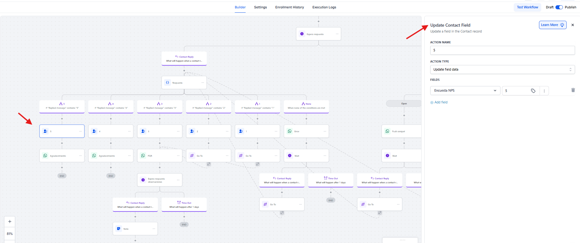 5Cuando el contacto responde correctamente con un valor válido, el sistema guarda dicha respuesta en el campo personalizado Encuesta NPS, asegurando que la información quede registrada y disponible para análisis posteriores.