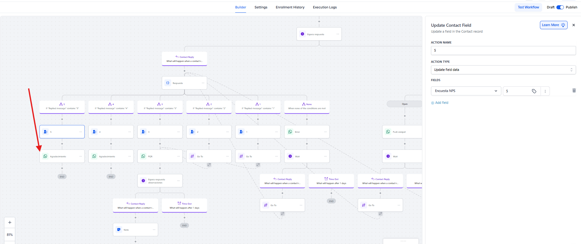 Cuando el contacto responde con una nota de 4 o 5, el flujo ejecuta una acción de envío de mensaje de agradecimiento.