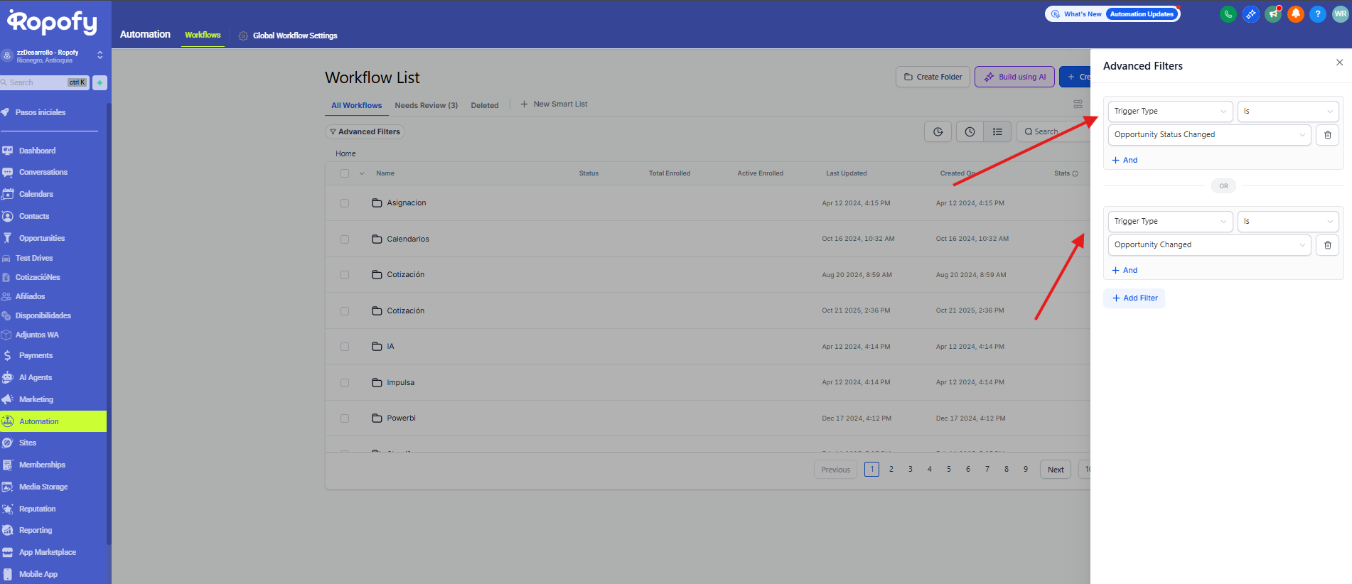 Para buscar los flujos de trabajo que corresponden a los flujos de reseñas en Ropofy, primero debemos dirigirnos al apartado de “Automation” o “Automatizaciones”.