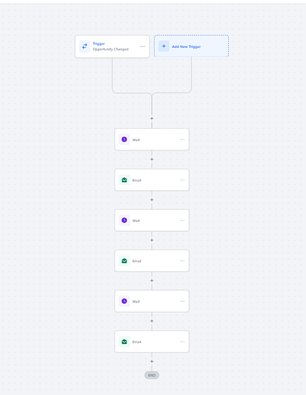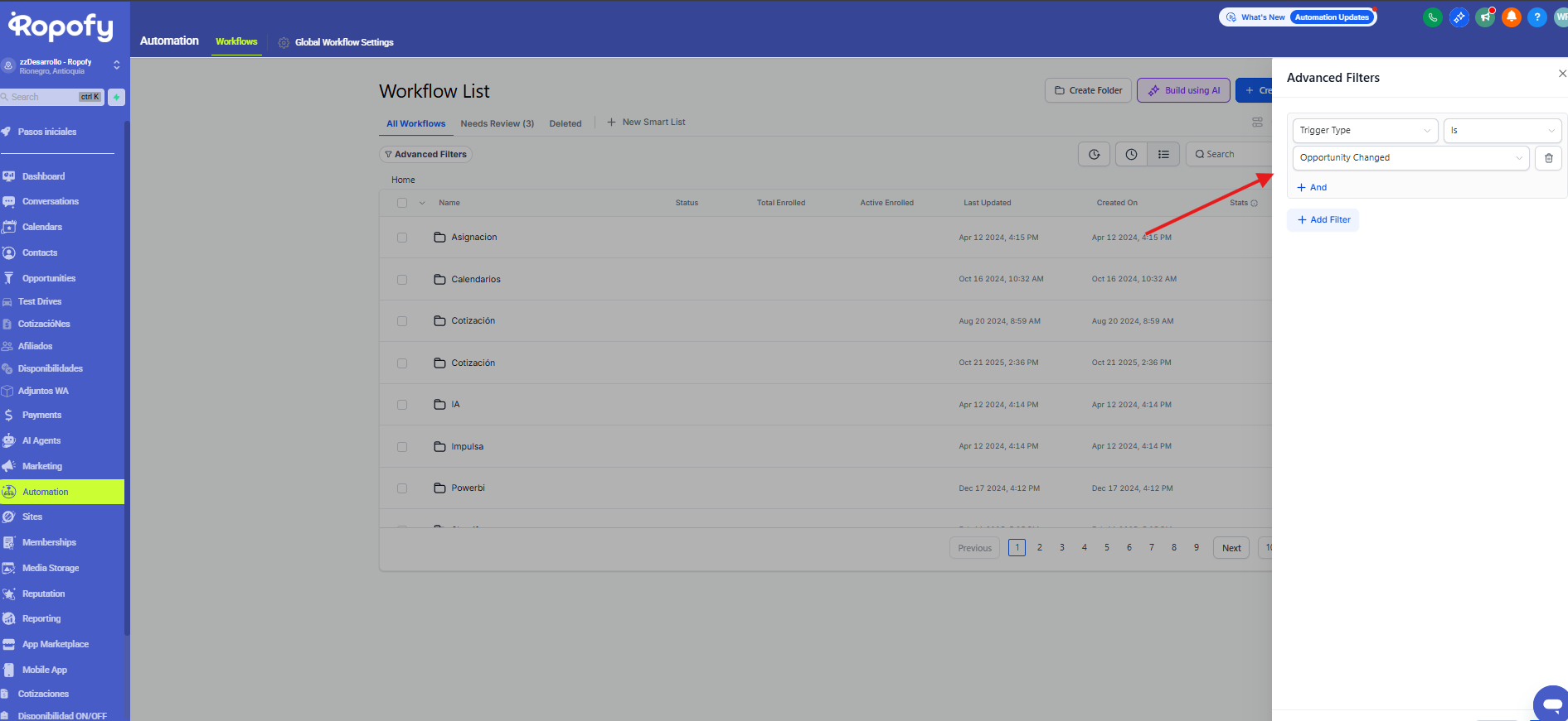En Ropofy, los flujos de nutrición se gestionan mediante Workflows, los cuales permiten ejecutar acciones automatizadas cuando se activa un disparador específico, como el ingreso de una oportunidad a una etapa concreta del pipeline.