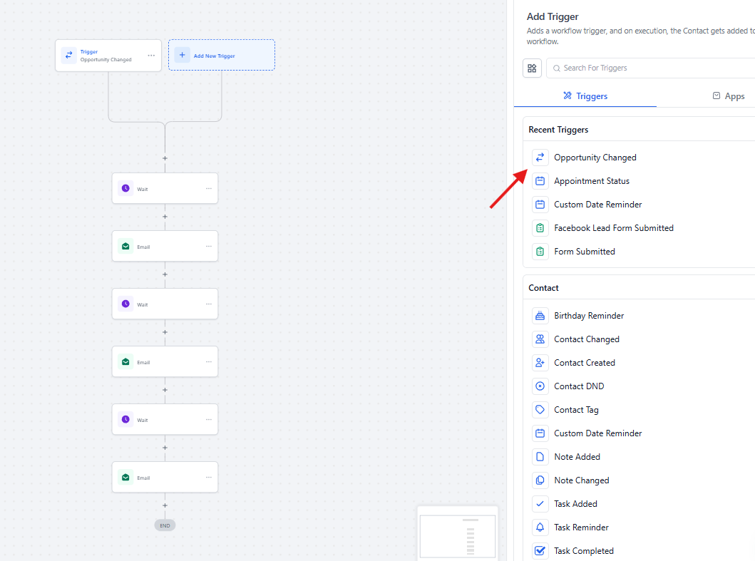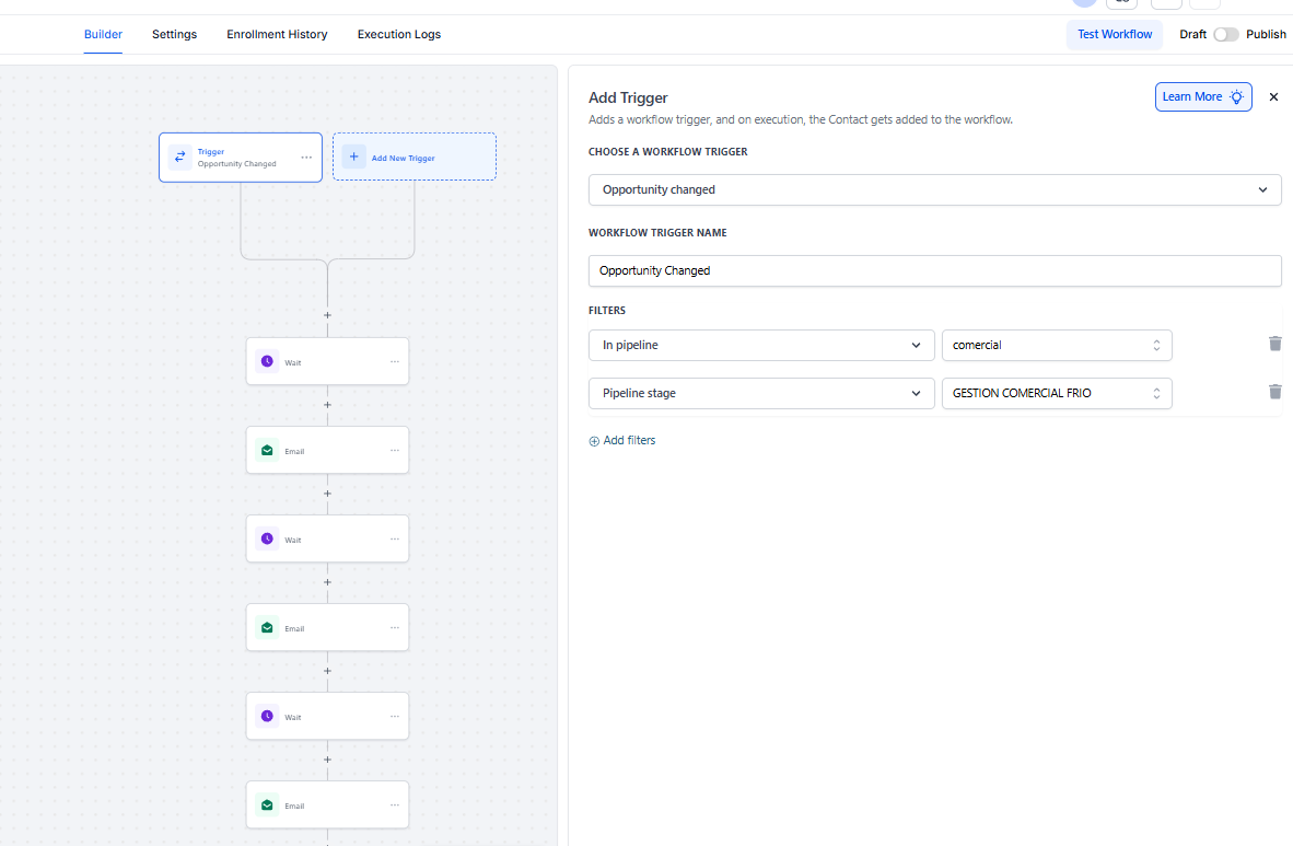 Normalmente, se utiliza como disparador “Opportunity Changed”, ya que permite detectar cambios en una oportunidad dentro del pipeline y, a partir de ello, ejecutar flujos de nutrición de manera automática según la etapa en la que se encuentre.
