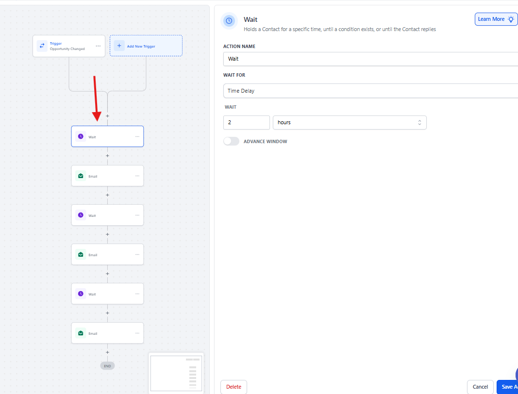 En este flujo se ha configurado una espera de 2 horas antes de continuar con la siguiente acción.