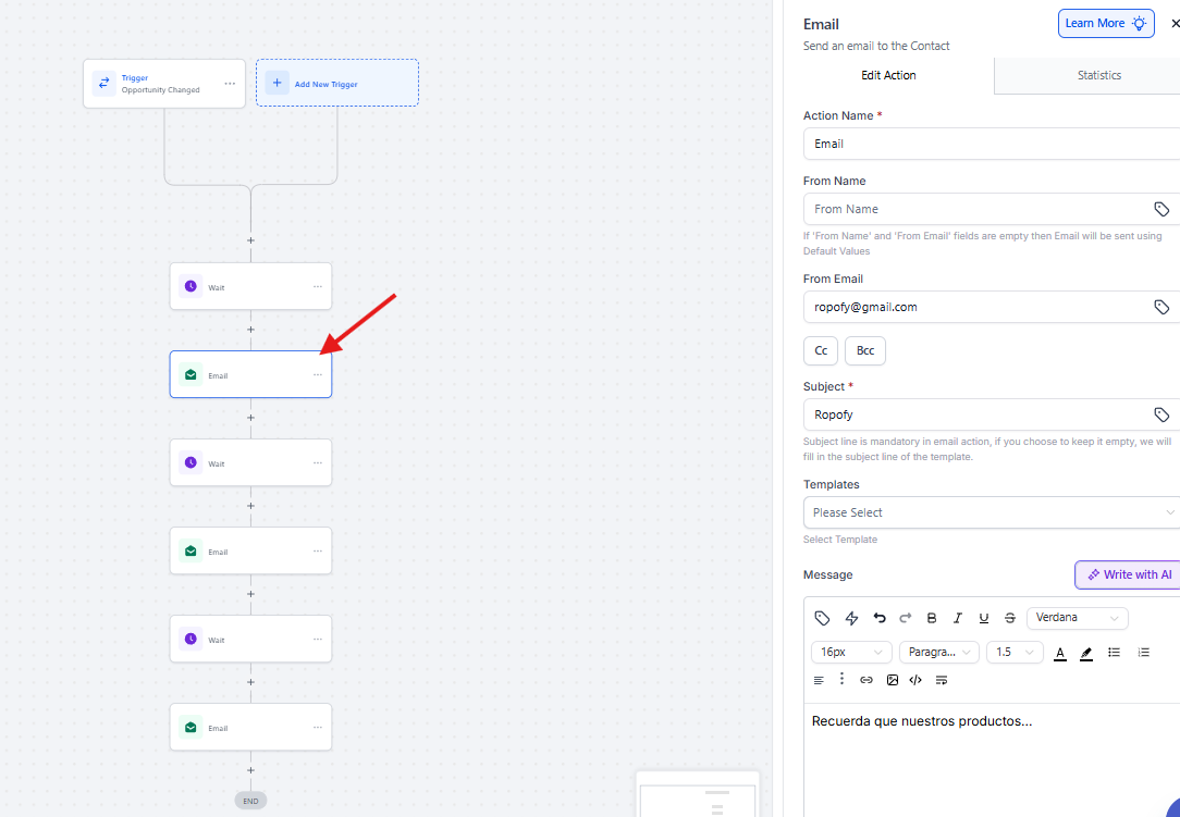 Un flujo de trabajo puede incluir tantas acciones de “Espera” y “Correo” como sea necesario, permitiendo diseñar secuencias completas de seguimiento automático. Por ejemplo: