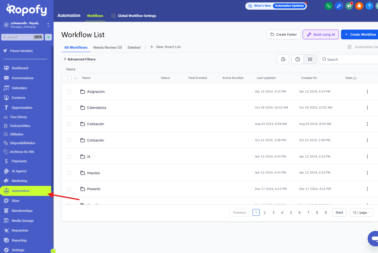 Para buscar los flujos de trabajo que corresponden a los flujos de Reactivación en Ropofy, primero debemos dirigirnos al apartado de “Automation” o “Automatizaciones”.