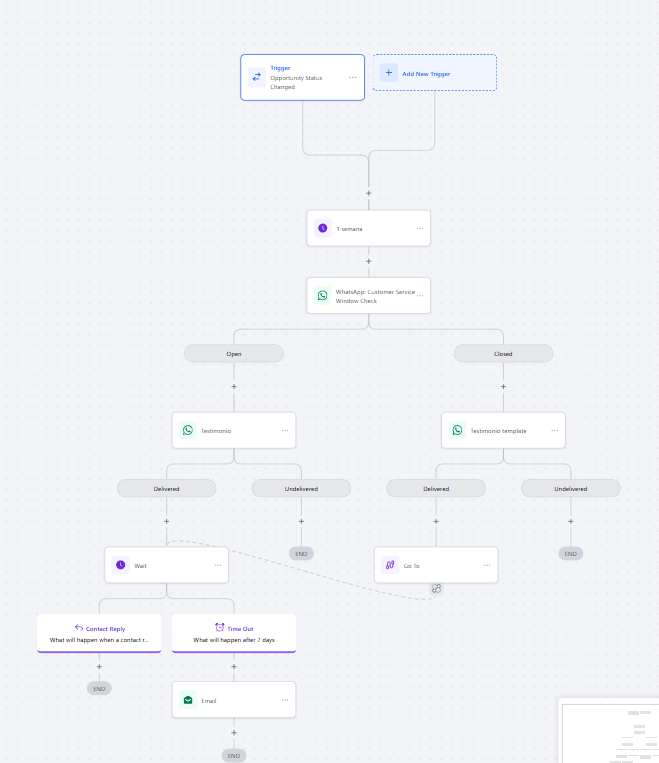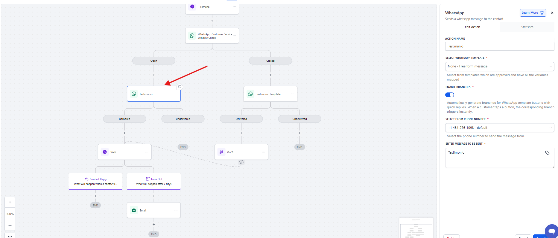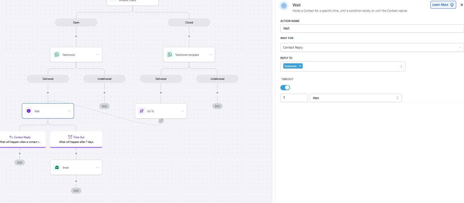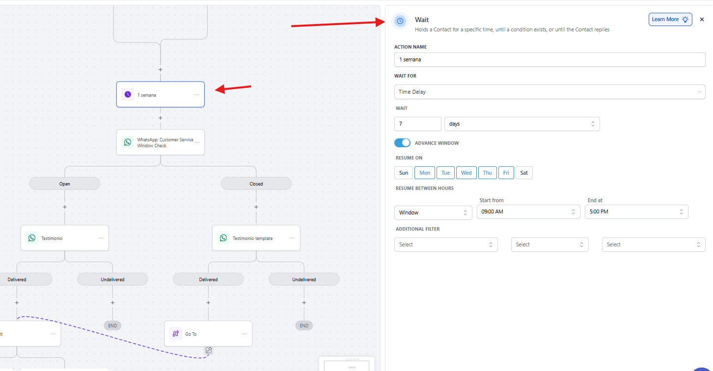 A diferencia de un simple retraso fijo, esta acción está configurada para esperar una respuesta directa del contacto a un mensaje previamente enviado, en este caso el mensaje de “Testimonio” enviado por WhatsApp.